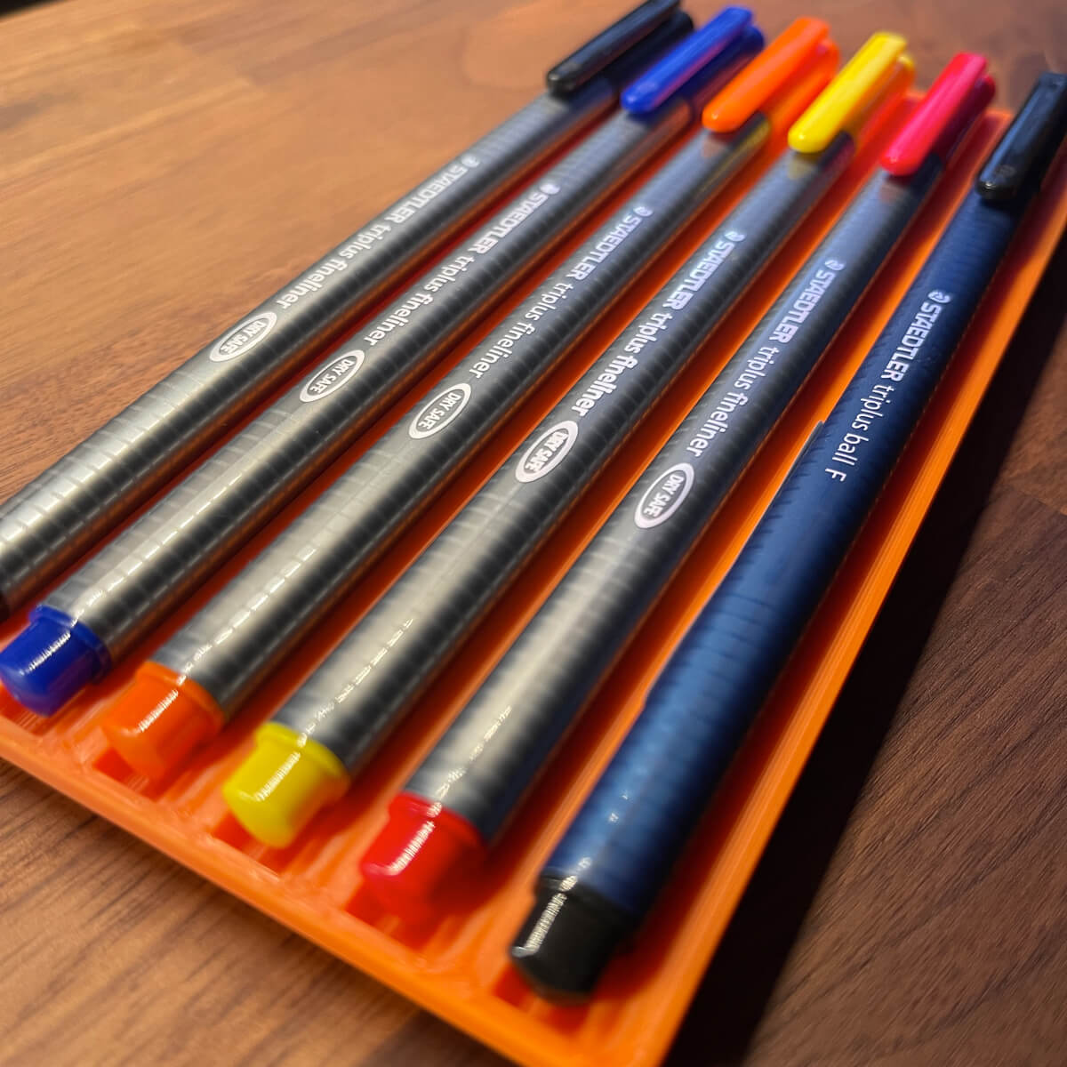 In the next version, I'll increase the thickness a little more to be able to improve the fit. The pens will sit deeper into the lid, so a groove to be able to grab the pens will be needed. But, most importantly, I want to make the underside gridfinity-compatible. That way, I'll be able to take off the lid and place it on any other baseplate - which is important to be compatible with other projects I'm working on.