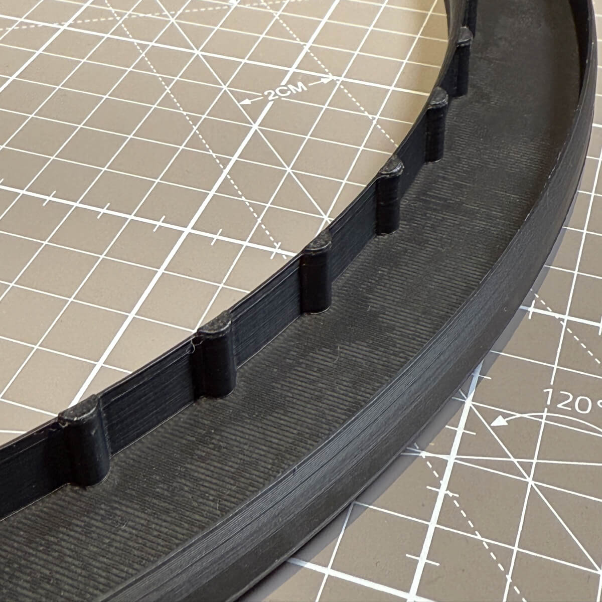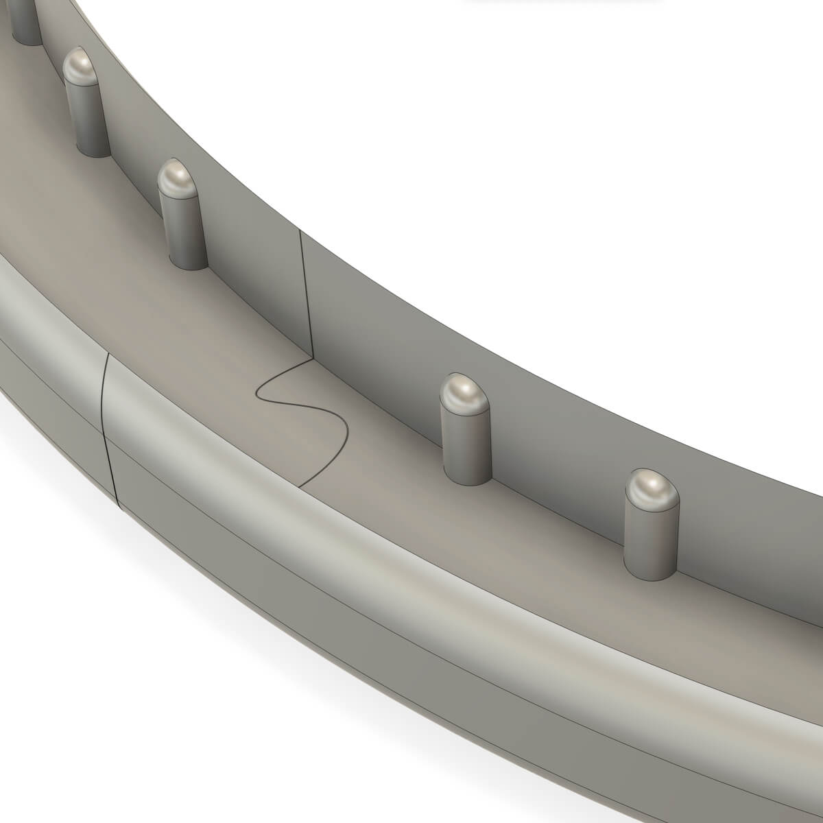 Here's where things got interesting. The full rim was too large for my print bed, so I needed to split it into multiple parts. I decided on a 4-piece design that would connect together like a jigsaw puzzle.